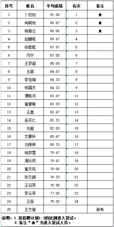 根據(jù)有關(guān)規(guī)定要求和本次招聘活動的統(tǒng)一安排,現(xiàn)將《某市直機關(guān)招聘輔助工作人員初試成績及進入復試人員名單》予以公布,望查閱。